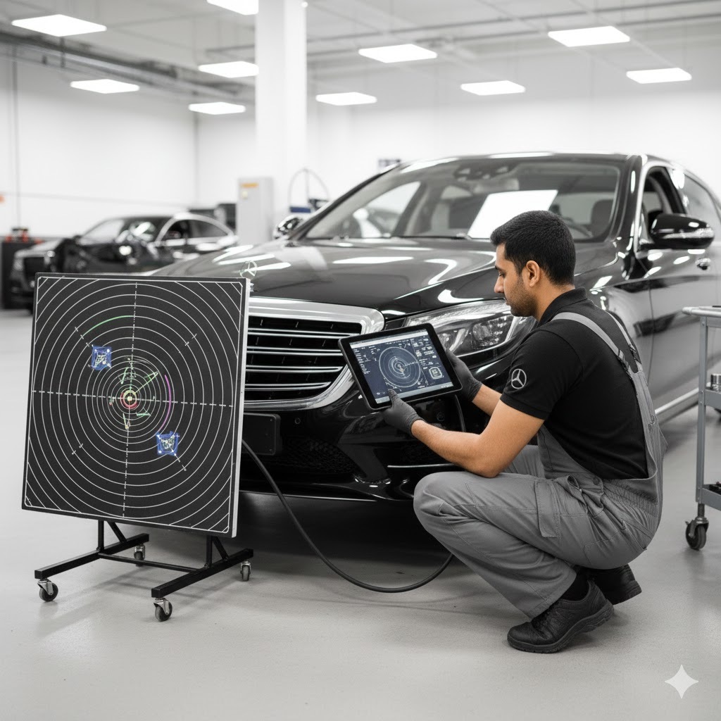 خدمة احترافية لفحص وبرمجة ومعايرة رادار السيارة الخاص بأنظمة القيادة الذكية ADAS باستخدام أجهزة معايرة متقدمة لضمان الدقة العالية والأمان أثناء القيادة.
