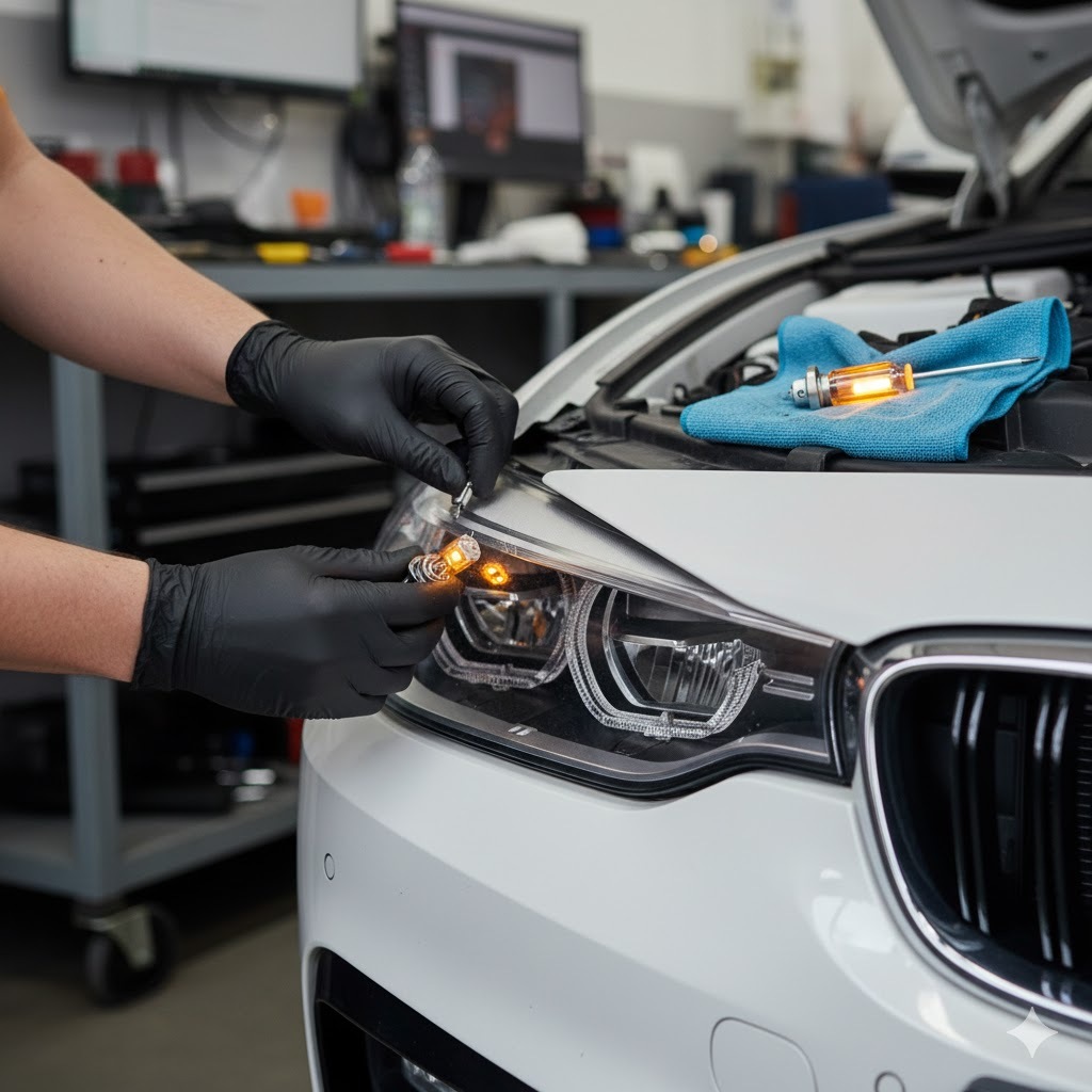 خدمة استبدال لمبات الإشارات الأمامية مع فحص الدائرة الكهربائية للتأكد من عمل الوميض بشكل صحيح وبدون تسارع أو ضعف إضاءة.